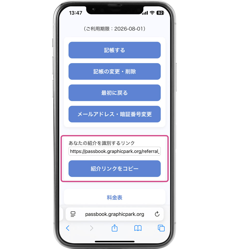- ただし、お知り合いの方が「紹介専用ページ」の[ご紹介特典で記帳する]をタップしないで支払った場合は、利用期間延長にはなりませんのでご了承ください。